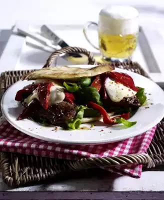 Spread the salad on the undersides of the breads. Sprinkle with balsamic cream. Cover steaks with paprika and mozzarella. Put the lid on the pan and let the cheese melt for about 1 minute. Spread the steaks on the breads.