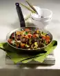 Heat oil in two portions in a large pan, add half of the meat and fry for 2 minutes, turning the meat. Remove from the pan and season with salt and pepper. Fry the rest of the meat in the same way. Put salad, paprika and silver onions in 6-8 glasses. Arrange the meat on top and serve garnished with thyme and chilli pepper