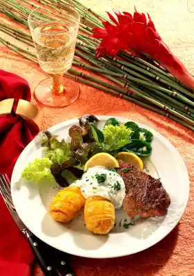 Wash herbs, chop, stir in. Season with salt and pepper. Wash the steaks and dab dry. Heat oil in a coated pan and fry the steaks on both sides. Season with salt and pepper.
