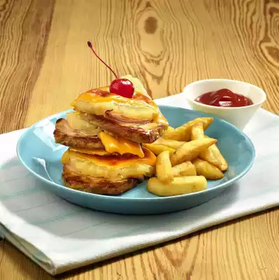 Drain the pineapple. Cover the steaks with 2 slices of ham, 1 slice of pineapple and 1 slice of sliced cheese. Slide over the French fries in the oven and bake for 10 minutes. Stack 3 steaks on top of each other and garnish with 1 cocktail cherry each. Arrange the French fries with the steak stacks on plates. Ketchup tastes good with them