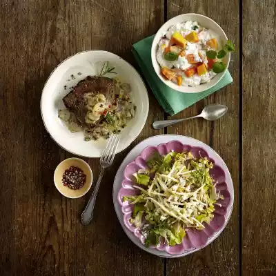 Remove the meat, wrap it in aluminium foil and let it rest for a short time. Add mushrooms, onion and peppercorns to the pan. Fry for approx. 5 minutes, turning. Season with salt. Add cream and bring to the boil.