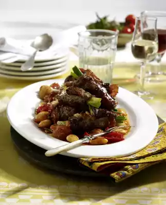 Rinse the beans and let them drain. Peel and chop the garlic. Wash the rosemary, remove the needles. Wash the tomatoes. Cut ham lengthwise in half. Clean and wash spring onions, cut into 3 pieces. Dab meat dry, pepper.