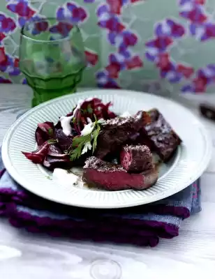 Remove meat from the oven, wrap in aluminium foil and leave to rest for a short time. Wash the parsley, shake dry, pluck the leaves from the stalks and chop finely, except for something to garnish. Cut steaks into wide strips. Arrange beetroot salad and steak strips. Sprinkle with crème fraîche dip, sprinkle with parsley and garnish