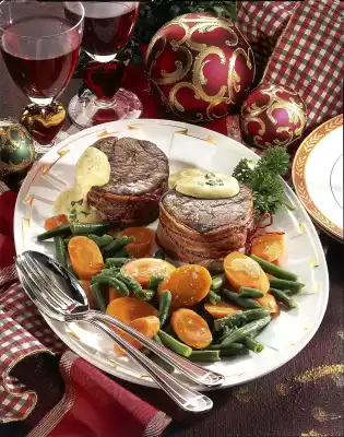 Peel, wash and slice the carrots. Cook the beans and carrots in boiling salted water for about 10 minutes, then drain. Dab fillet steaks dry. Wrap each steak with two slices of bacon and fasten with kitchen string.