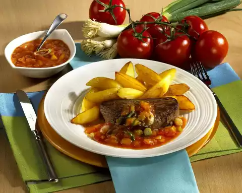 Salt the potatoes and move them to the edge of the pan. Fry the steak for 2-3 minutes on each side. Season with salt and pepper. Season to taste curry-peach sauce. Arrange everything