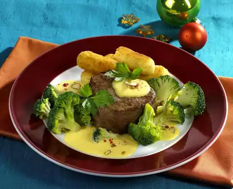 Stir in sauce powder and bring to the boil. Cut butter into small pieces and stir in gradually at low heat. Season with crushed pink berries and a few squirts of orange juice. Heat the frying fat in a deep fryer. Fry the croquettes for about 5 minutes. Arrange steaks with broccoli and hollandaise sauce on plates. Serve garnished with parsley