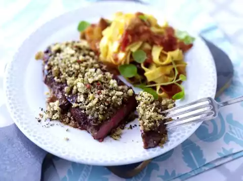 Season with fleur de sel. Spread the bread and pepper mixture over the steaks. Roast in a hot oven for about 6 minutes.