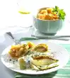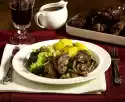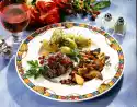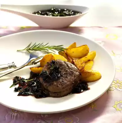 Sauté the onion and rosemary in the frying fat. Stir in a good 1/8 l water, vinegar, maple syrup and 1/3 blueberries, bring to the boil. Simmer at high heat for 6-8 minutes. Heat the remaining berries briefly. Season sauce and potatoes with salt and pepper. Arrange everything. Fried mushrooms taste good with it