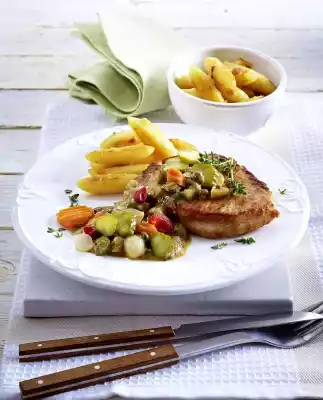 In the meantime heat the fat in a second coated pan. Fry the potato noodles for about 5 minutes until golden brown. Stir mustard into the sauce. Add mixed pickles and capers and heat up. Season to taste. Serve steaks with Westmorland sauce and potato noodles.