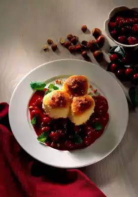 Stir starch with a little water until smooth and add to the boiling juice. Bring to the boil briefly while stirring. Add cherries and kirsch. Arrange steamed noodles with stewed cherries on plates. Sprinkle with remaining filling as desired.