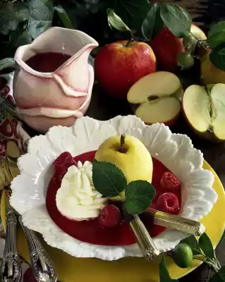 Defrost the raspberries. In the meantime, wash and peel the apples, leaving the stalks standing. Boil up the apple and lemon juice and cinnamon. Steam apples for about 7 minutes, turning them once.
