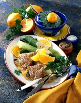 Stir in the sauce thickener and bring to the boil again. Stir in yoghurt and orange peel and season with salt and orange pepper. Arrange leek with schnitzel and the sauce on a plate. Garnish with orange slices and parsley.