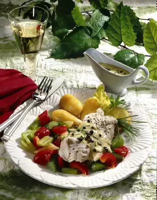 Wash the chives, dab dry and cut into small rolls. Add chives and capers to the sauce and stir in. Arrange vegetables and fish on plates. Sprinkle fish with coloured pepper and pour sauce over it.