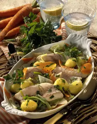 Peel and wash the potatoes and cook them in the broth for ten minutes. In the meantime, clean and wash the carrots, leek and celery. Cut leek into strips, carrots and celery into thin lozenges or slices. Wash fish fillets, dab dry and cut into four to six pieces. Mix the vegetables, potatoes and stock and place in an ovenproof dish.
