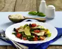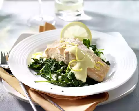 Steam spinach for 2-3 minutes until it has completely collapsed. Season to taste with salt, pepper, nutmeg and sugar. Carefully reheat the sauce. Cut the remaining half lemon into slices.