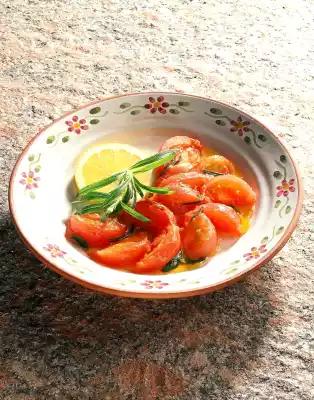 Steam the tomatoes and rosemary for three minutes at low heat. Season with salt, tabasco and lemon juice. Garnish with lemon and rosemary.