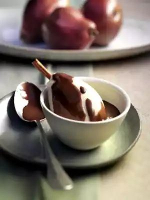 Remove the pears from the stock and serve with the espresso chocolate sauce.