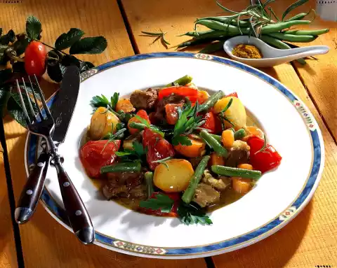 Season meat with salt, pepper and rosemary. Dust with flour and curry. Deglaze with white wine and stock. Cover and stew for about 45 minutes. In the meantime clean, wash and cut the beans into small pieces.