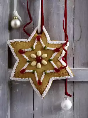 For the dough mix flour and baking soda. Add sugar, butter, egg, salt, vanillin sugar and honey and knead first with the dough hooks of the hand mixer, then with your hands to a smooth dough. Leave the dough to rest in the refrigerator overnight. Make a template for cutting out the dough beforehand. Roll out the dough on a floured work surface to a thickness of about 1 cm. Cut out a star (approx. 21 cm Ø). Cut a small hole at one end so that the star can be hung up.