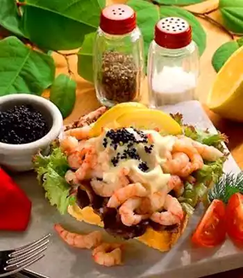 Toast white bread. Top with lettuce leaves, the plaice fillets and shrimps. Add mayo cream and caviar. Garnish with lemon.