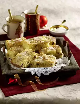 Spice the stollen and spread 100 g butter in flakes in the hollows. Sprinkle with 50 g sugar and flaked almonds. Bake in the preheated oven (electric cooker: 200 °C/ convection oven: 175 °C/ gas: level 3) for 15-18 minutes. Remove from oven, place on a rack and let cool slightly. Stir icing sugar, except for 1 tablespoon, and 5-6 tablespoons of water until smooth. Cover the cake with it in wide strips. Leave to dry. Dust with 1 tablespoon of icing sugar
