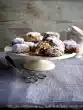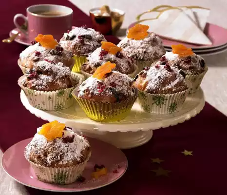 Spread the rest of the butter again, dust with 50 g icing sugar and allow to cool. Cut 6 apricots horizontally and cut out stars. Chop 25 g cranberries. Remove the muffins from the tin and dust them again with 50 g icing sugar. Decorate with apricot stars and cranberries. Place the muffins in Christmas paper cuffs