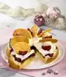 Defrost berries in a bowl. Then puree two thirds with jam sugar for about 45 seconds. Fold in remaining berries. Carefully dip the star-shaped cups briefly into hot water and turn them over. Serve with the berry puree. Decorate with the remaining roasted almonds