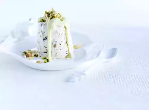Separate eggs. Beat egg whites and cream separately until stiff and cover and chill. Whisk egg yolk and sugar with the whisks of the mixer for 3-5 minutes until white and creamy. First fold in the stollen pieces, pistachios and almonds, then the cream and then the beaten egg white.