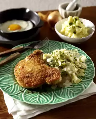 Wash and peel the potatoes and cook them in boiling salted water for about 20 minutes. Melt 2 tablespoons of butter in a saucepan, dust with flour and sauté while stirring. Gradually stir in 350 ml stock and 250 ml milk. Let simmer for about 5 minutes. Wash the meat and pat dry. Whisk 1 egg in a deep dish, season with salt and pepper. Turn the chops first in the egg, then in the panko crumbs