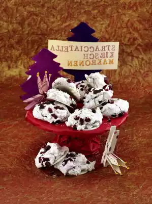 Finely chop the chocolate and cherries, set aside 25 g of cherries for sprinkling. Beat the egg whites and salt with the whisks of the hand mixer until very stiff. Gradually add the sugar, so that the mixture is firm and shiny
