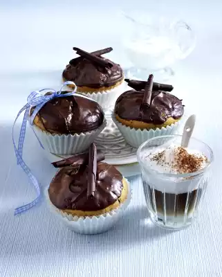 Leave to cool until the chocolate begins to thicken. Dip the muffins with the surface into the chocolate and let them get firm. If necessary, reheat the rest of the chocolate. Spread thinly on a cool marble board or the back of a baking tray and refrigerate. As soon as the chocolate is firm, scrape with a spatula or pallet of rolls. If necessary, put the rolls in a cool place for a short time. Decorate muffins with chocolate rolls