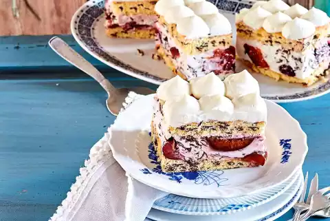 Halve the sponge cake crosswise, place a rectangular cake frame around one half, spread the cream on top. Place the rest of the sponge cake on top. Chill the cake for at least 3 hours.