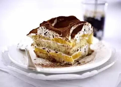 on it. Layer the remaining biscuits, coffee, cream and oranges. Finish with a layer of cream. Chill tiramisu for 3-4 hours. Dust with cocoa just before serving.