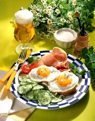 Spread each slice of bread thinly with fat and cover with ham. Place 2 fried eggs on each slice. Serve with the cucumber salad. Garnish with tomato and parsley if desired