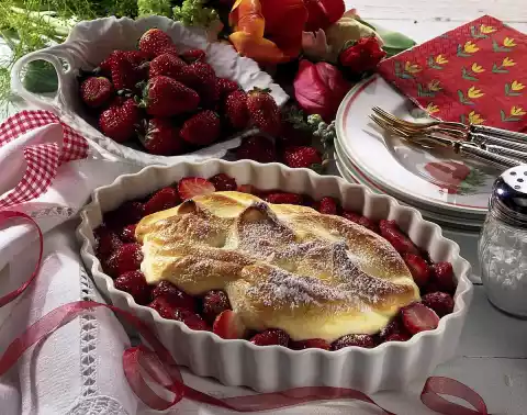 Beat the egg white until stiff and allow the remaining sugar to trickle in. Carefully fold the egg yolk mixture into the beaten egg white and spread on the strawberries. Bake in the preheated oven (electric: 175 °C/ gas: level 2) for 12-15 minutes.