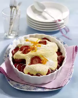 Egg whites in two portions and fold into the egg yolk mixture. Arrange the strawberries in an ovenproof dish. Place the mixture on top and spread loosely. Bake in the preheated oven (electric cooker: 175 °C/ convection oven: 150 °C/ gas: level 2) for 25-35 minutes.