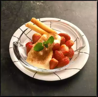 Wash, clean and halve the strawberries. Divide into 4 bowls. Put the egg, egg yolk, sugar and amaretto in a bowl and beat until frothy on a hot water bath. Pour zabaglione over the strawberries and dust with cocoa.