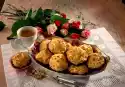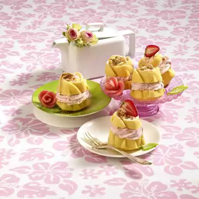 Grease the hollows (12 pieces) of a rose muffin tin and dust with flour. Fill each well to 3/4 with dough. Bake in the preheated oven (electric: 175 °C/ convection oven: 150 °C/ gas: level 2) for 25-30 minutes. Let muffins cool down for about 1 hour. Wash strawberries and, except for a few for decoration, clean, chop smaller and puree. Mix cream cheese, 40 g sugar and puree. Fill into a piping bag with star-shaped spout. Cut muffins in half horizontally. Spray cream cheese cream onto the lower halves and cover with the upper halves.
