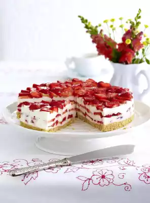 Cut the rest of the cream in half, spread one half on the strawberries and put 1⁄3 strawberries on top. Spread with the rest of the cream. Cover with the remaining strawberries. Chill overnight.
