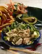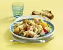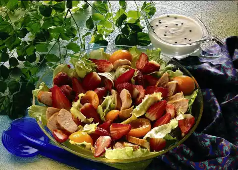 Cut the chicken filets into slices. Mix salad, strawberries, apricots and chicken and place in a large bowl. Add yoghurt sauce extra.