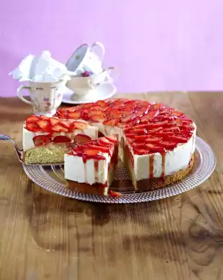 Spread the rest of the yoghurt cream on top so that the rim is closed, chill for approx. 2 hours. Wash, clean and slice 350 g strawberries thinly. Remove the cake from the cake ring, place the strawberry slices slightly overlapping on the cake. Heat the jelly in a pot, pour over the strawberries and chill for about 30 minutes