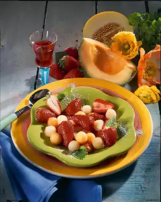 Wash, clean, halve and drain the strawberries. Remove seeds from melon halves with a tablespoon and cut out balls from the flesh with a ball cutter. Mix liqueur, honey and lemon juice well with a whisk. Mix strawberry halves and melon balls and pour the liqueur-honey-marinade over them. Leave to stand for about 10 minutes and arrange on plates dusted with icing sugar. Serve decorated with lemon balm as desired