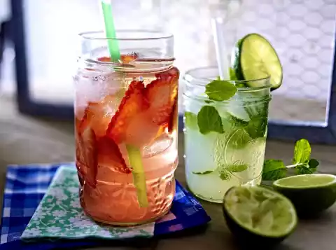 For the Mint Lime Drink, cut limes in half and squeeze the juice. Bring the sugar and lime juice to the boil and simmer briefly until the sugar has dissolved. Let the syrup cool down. Wash the peppermint, shake dry, pluck the leaves from the stalks. Pour the mint, syrup, bitter lemon and 1 bottle of Prosecco into a large carafe (approx. 1.5 litres capacity), mix and fill up with ice