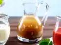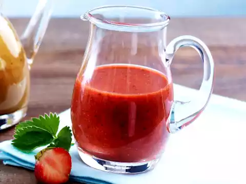 Wash and clean the strawberries and put them into a tall cup. Wash the basil, pluck the leaves and add to the strawberries, puree both. Stir in vinegar. Fold in the oil. Season with salt, pepper and possibly sugar. Tastes great with green salad with beef steak or as a dressing with strawberry-asparagus salad.