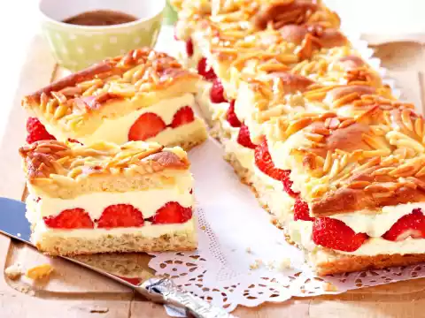 Spread a thin layer (approx. 0.5 cm thick) of buttercream on the lower parts of the 4 strips and cover with strawberries. Spread the remaining buttercream on top and cover with the upper parts of the strips. Press on lightly. Cover and leave to cool for at least 1 hour (or in a cool place, e.g. a cellar, for about 3 hours). Cut each strip into 6-7 pieces with a serrated knife. Dip the knife into hot water in between.