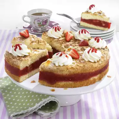 Add the mixture and smooth it down. Mix almonds and 25 g sugar, sprinkle on top. Bake in the preheated oven (electric cooker: 200 °C/ convection oven: 175 °C/ gas: level 3) for 15-20 minutes. Let them cool down. Soak gelatine in cold water. Wash and clean the strawberries. Put 50 g strawberries aside for decoration. Cut 200 g strawberries into slices. Puree remaining strawberries with 50 g sugar. Put 2 tablespoons of puree to decorate in a cool place. Squeeze the gelatine well, dissolve and stir into the puree. Fold in the strawberries. Remove the base from the mould, cut in half crosswise.
