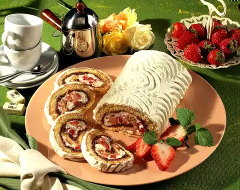 Let it cool down on a cake rack. For the filling, wash and clean the strawberries and cut them into large cubes. Bring jam and 2 tablespoons of water to the boil and pass through a sieve. Unroll cooled sponge cake and spread with jam.