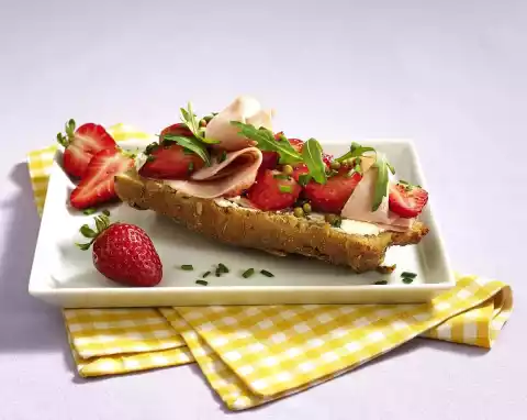 Cut bread in half horizontally, spread with cream cheese. Cover with ham and strawberry mixture. Spread rocket on top. Garnish with strawberries set aside