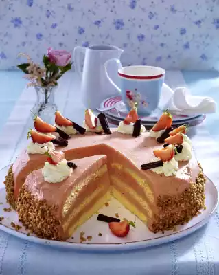 Place a springform pan rim around the bottom. Spread about 1/4 of the cream on top. Place the second cake base on top and press down gently. Spread about 1/4 of the cream on top, place the third cake layer on top and press down lightly. Chill for 20-30 minutes. Loosen the edge of the springform pan with a knife. Spread the rest of the cream on the cake. Let the cake set for at least 3 hours. Press the hazelnut brittle to the edge of the cake. Cut the remaining strawberries into slices. Cut the bark chocolate in half crosswise. If necessary, divide the pieces lengthwise into pieces. Whip the cream until stiff, allowing the cream to trickle in. Fill cream into a piping bag with star spout. Decorate the cake with cream tuffs, strawberry wedges and chocolate
