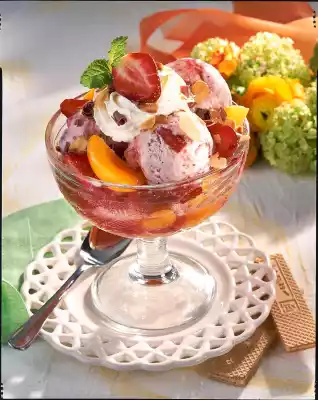 Arrange marinated strawberries and apricots in 4 glass bowls. Form 12 large balls (50-70 g) from the ice cream and place them on the fruit. Refreeze the rest of the ice cream. Decorate the sundae with cream, a strawberry half and lemon balm leaves. Serve sprinkled with flaked almonds and chocolate rolls. Serve with ice cream waffles
